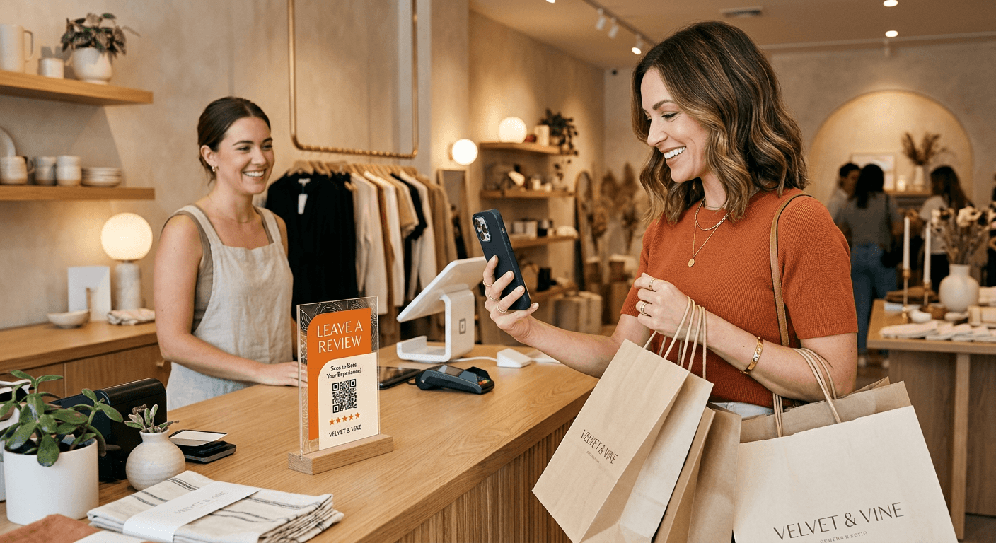 A QR code at the register or on the shopping bag invites customers to share their experience. They pick keywords like "great selection" or "friendly staff," and AI writes a genuine review.